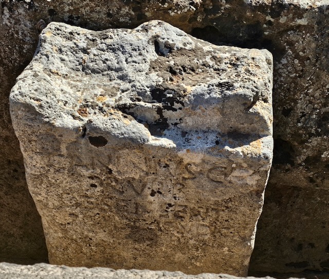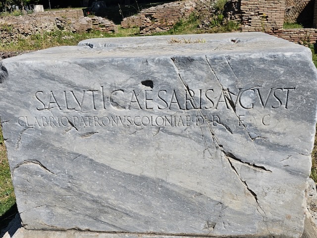 By contrast to the Christian inscription above, here we appear to have ‘save Tiberius Caesar Augustus’ and an inscription provided by Calabrio a patron of this Roman colony city.    Notice how wide the streets are and the umbrella or broom pine trees…