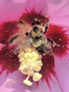 In my mature years, I have often watched (from a distance) the rather barrel-shaped, fuzzy bodies of honey bees dancing from blossom to blossom in the Rose-of-Sharon or across the precut fields of dandelions. They seem almost merry in their labors!