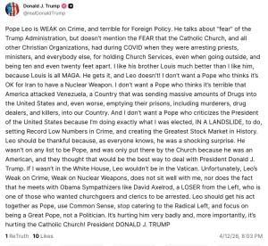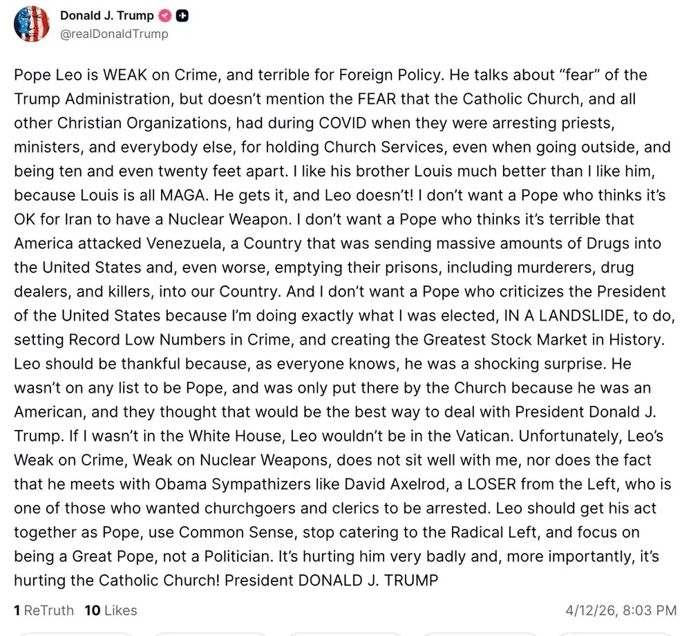 You can read about Trump’s post and also see the meme he posted portraying himself as Jesus Christ in this article. In the meantime, here’s a screenshot I took of the actual post. My favorite part is when Trump says that Pope Leo is weak on crime and nuclear weapons. As serious as all this is, I still laugh every time I think about that ridiculousness.